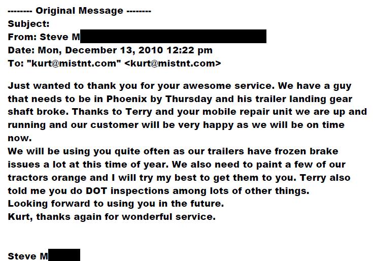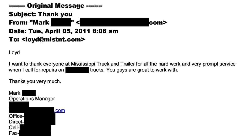 Mississippi Truck & Trailer Repair, Inc. was established in 1980 and has evolved from a 2-man operation into a workforce of over 30 people. Our team operates three shifts and are available 24 hours a day/7 days a week. Our team provides service to most of the major carriers in our area. Our services have grown to include a complete truck & trailer repair shop, full line collision body shop, tire repair shop, Sure-Trac Sales & Service, engine diagnostic systems, mobile axle repair and a 7day - 24 hour road service.